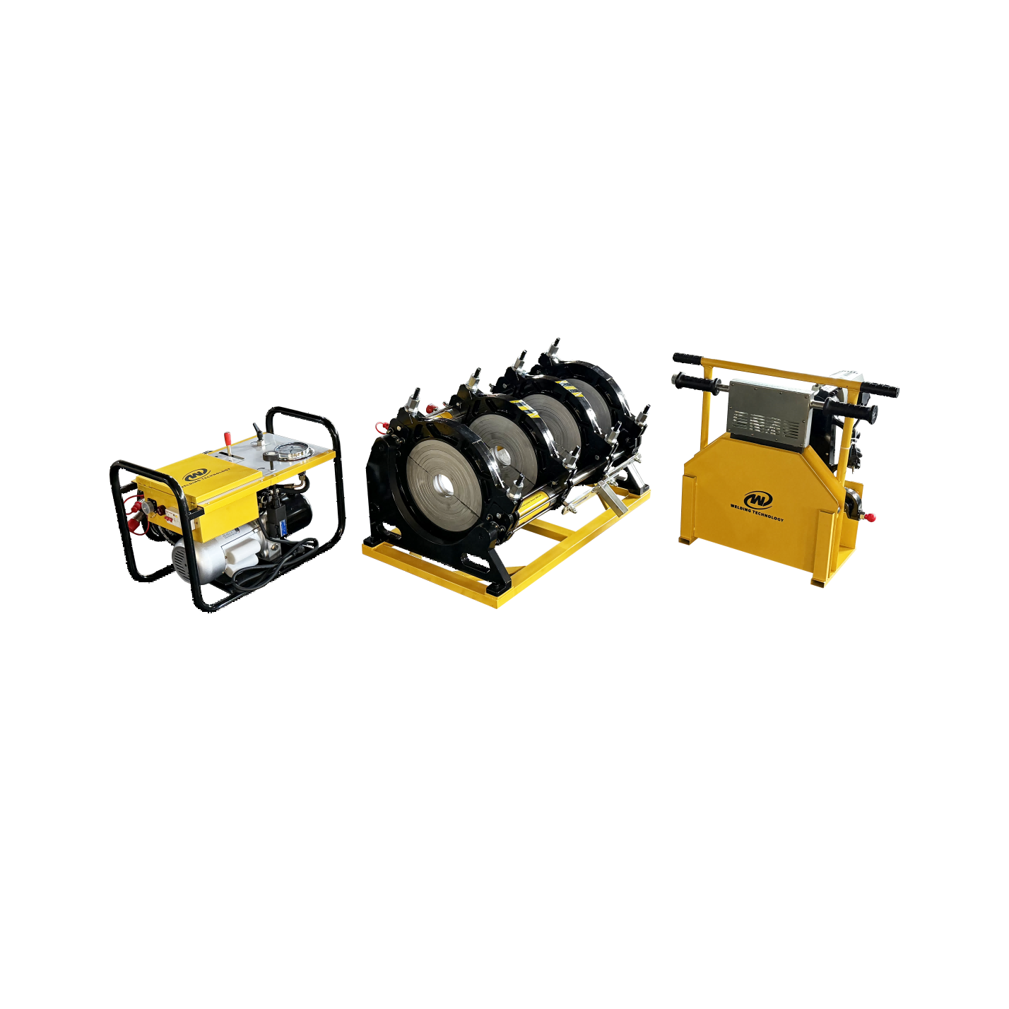 Máquina de soldadura por fusión a tope WD160H — WD355H, ampliamente utilizada en industria, protección contra incendios, fontanería, suministro de agua, alcantarillado y proyectos de riego. Solda directamente tuberías con codos, tes, cruces en Y, bridas y otras conexiones sin necesidad de equipos adicionales: basta con ajustar las varillas de sujeción. Compatible con tuberías y accesorios plásticos de PEAD, PP y PVDF.